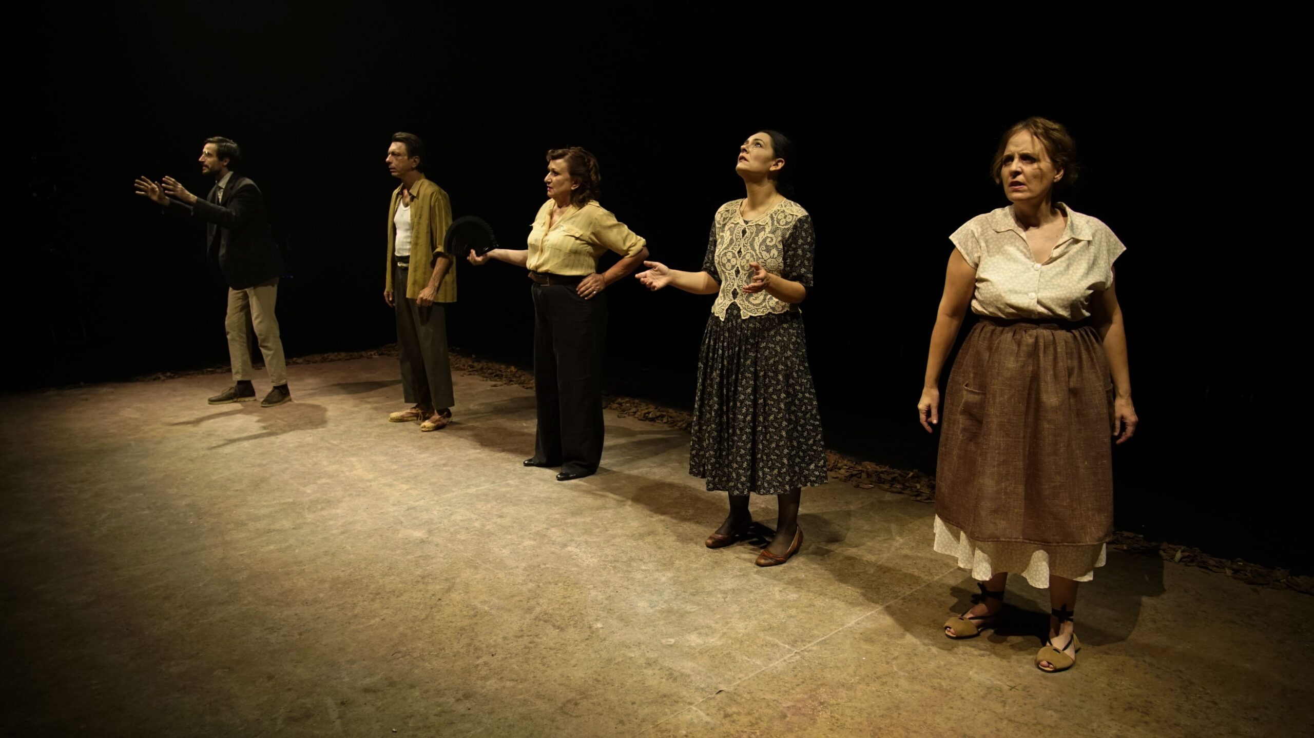 Los que comen tierra es un espectáculo que aúna tres puntos de vista de un mismo hecho en un mismo lugar, una fosa común. Tres momentos de espera. La espera para descansar, la espera de conseguir los restos de un familiar y la espera para ser ejecutado. La puesta en escena se basa en tres momentos cruciales de los protagonistas de esta historia, basándose, principalmente, en el trabajo interpretativo de los actores y en el texto. En la unión de las palabras con las imágenes, de los prosaico y de lo poético. De lo real y lo imaginado para dar voz a aquellos que un día la perdieron. Para hablar de los silenciado y sobre todo, de la dignidad y los derechos humanos.